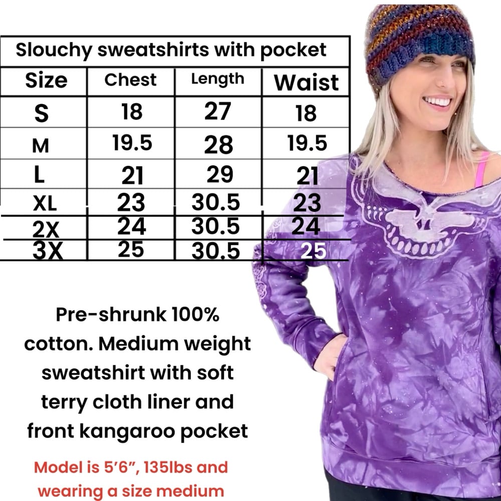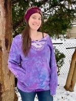 This 2X purple sweatshirt features a rainbow stealie at the front neckline, shooting stars on the sleeves and more stars on back neckline