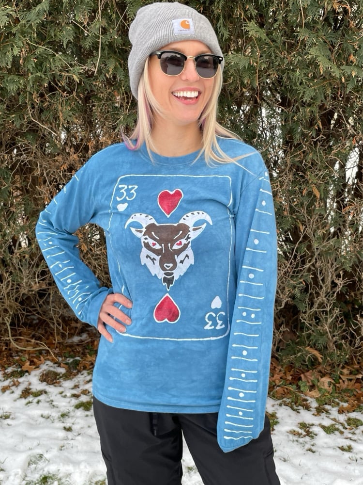 The front features a 33 of hearts playing card with a goat as the center heart. The sleeves have the frets of a guitar neck and the back has the letters BMFS in large font reaching from shoulder to shoulder on a shamrock green shirt.