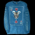 The front features a 33 of hearts playing card with a goat as the center heart. The sleeves have the frets of a guitar neck and the back has the letters BMFS in large font reaching from shoulder to shoulder on a dark blue shirt.