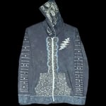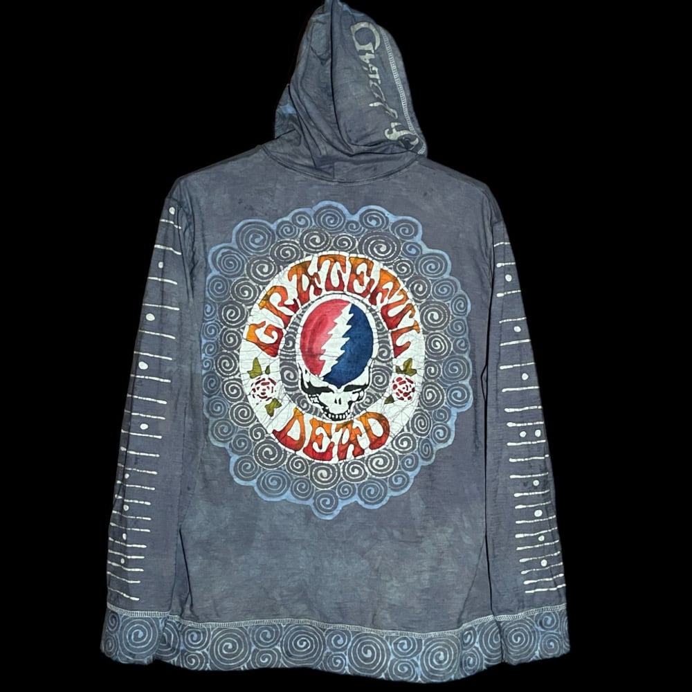 The back has large stealie inside of a frame that says “Grateful Dead” it’s reminiscent of an old biker vest patch. The “patch” is also surrounded by two toned spirals.