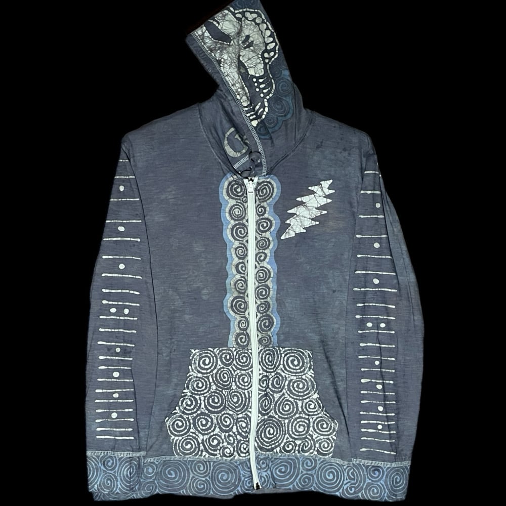 The front features a 13 point bolt on the chest and two toned spirals the length of the zipper and white spirals cover the whole front pockets. The bottom hem and cuffs of sleeves are also adorned with spirals.